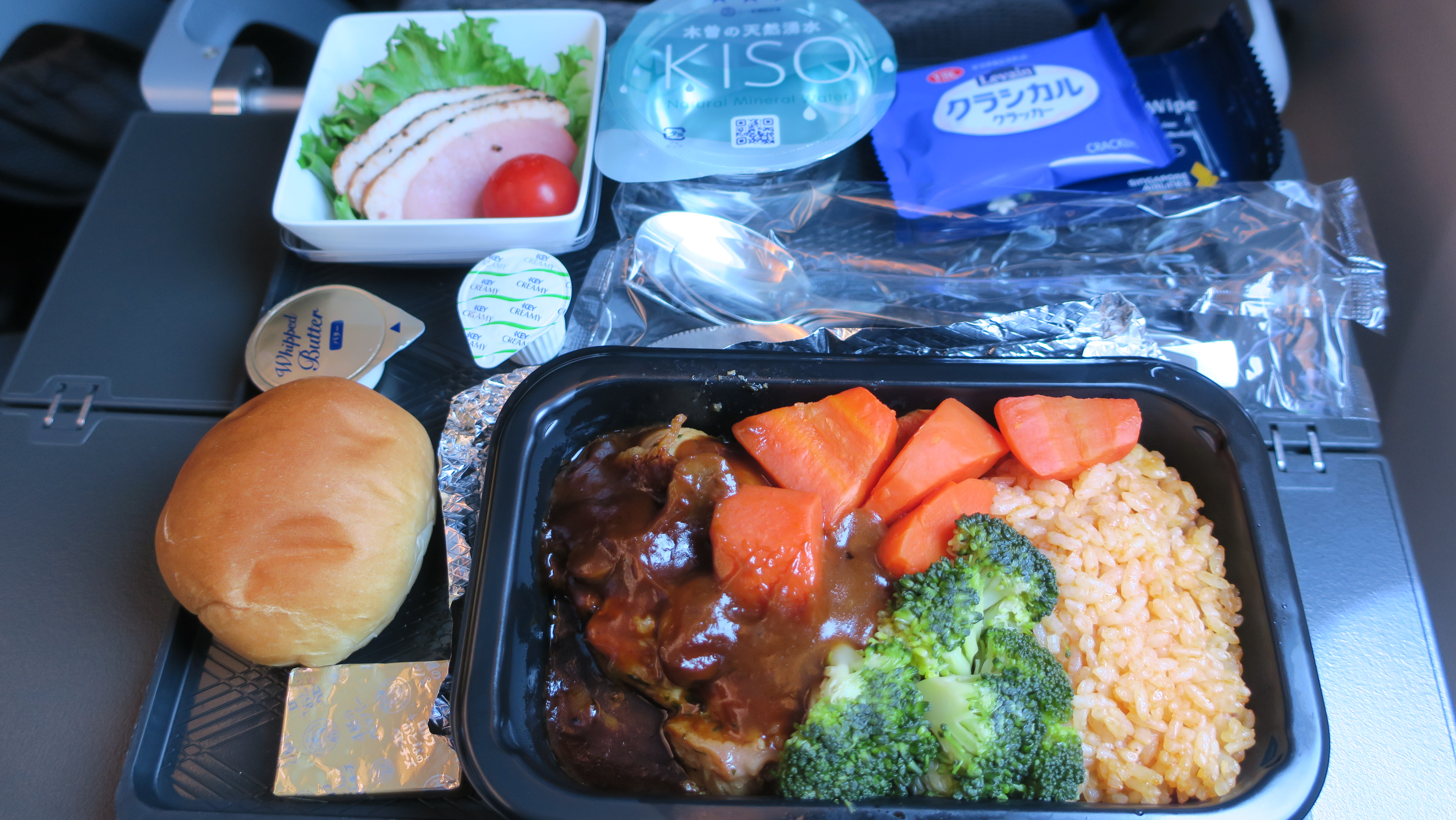 機内食にはデミソースのかかったチキンをセレクト.左上の鴨ローストも美味しかった. |