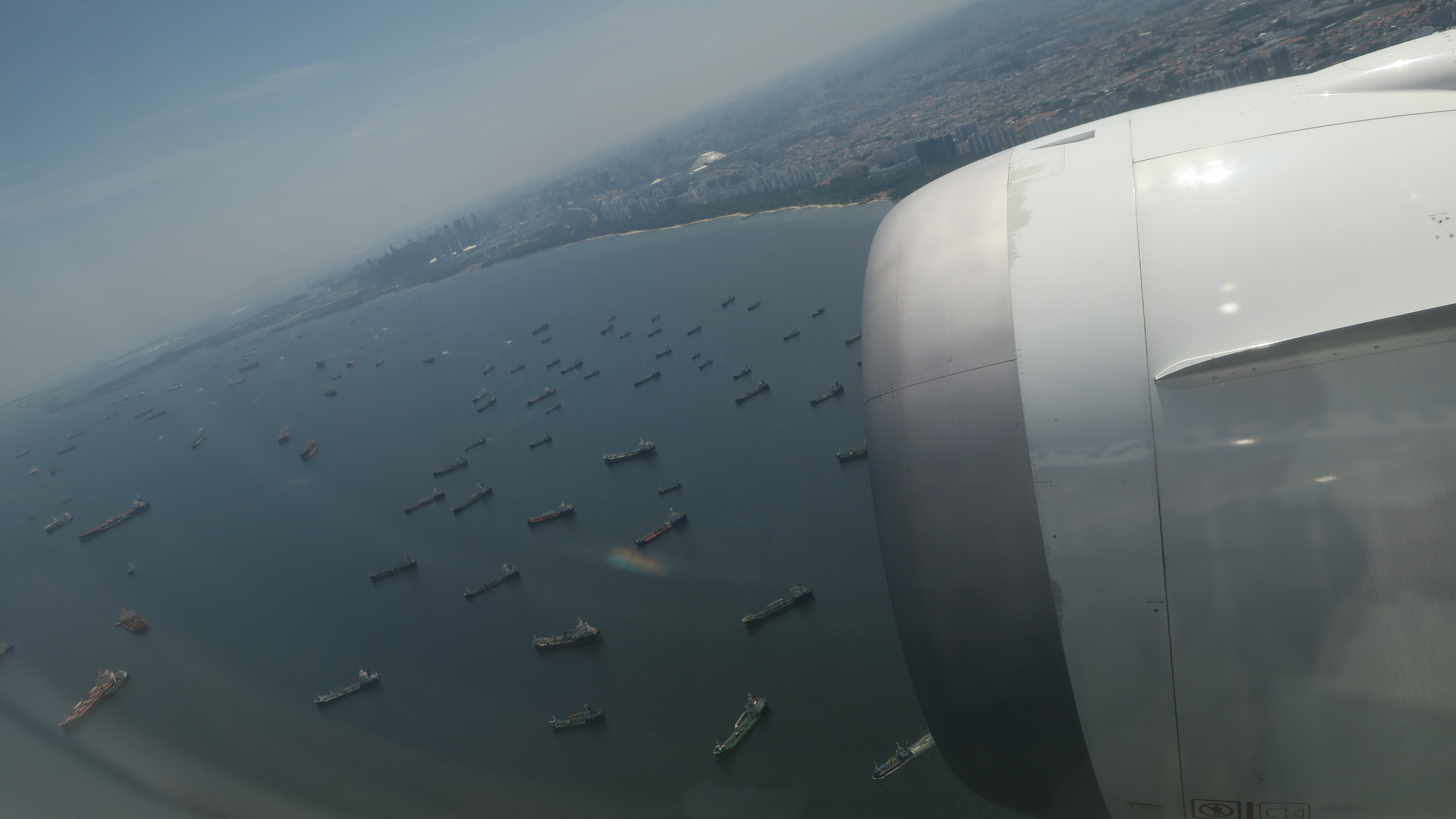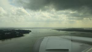 この日のチャンギ空港への着陸は,珍しく北からのアプローチ.右上の陸地はマレーシアとの国境をなすシンガポール領のウビン島. |
