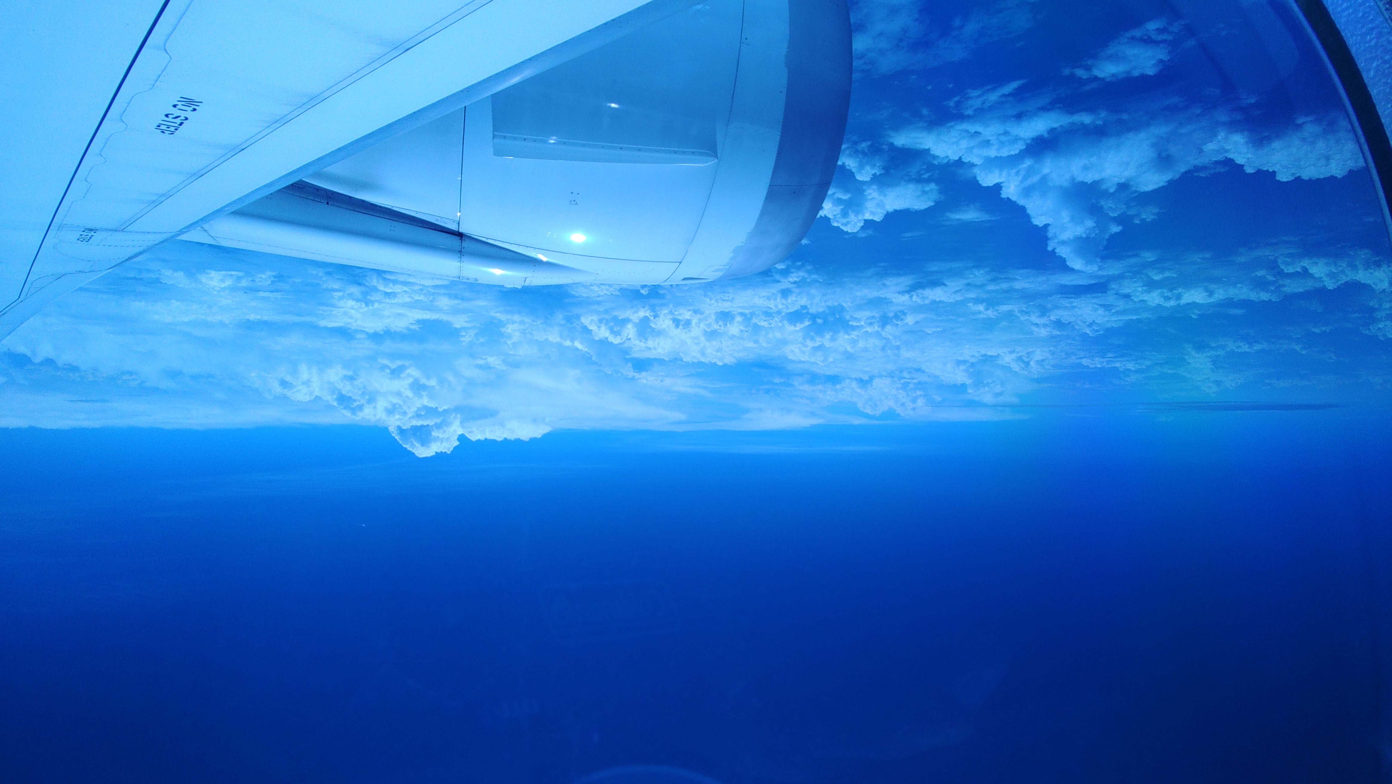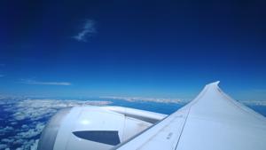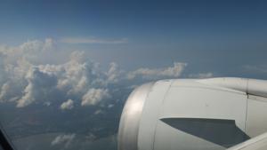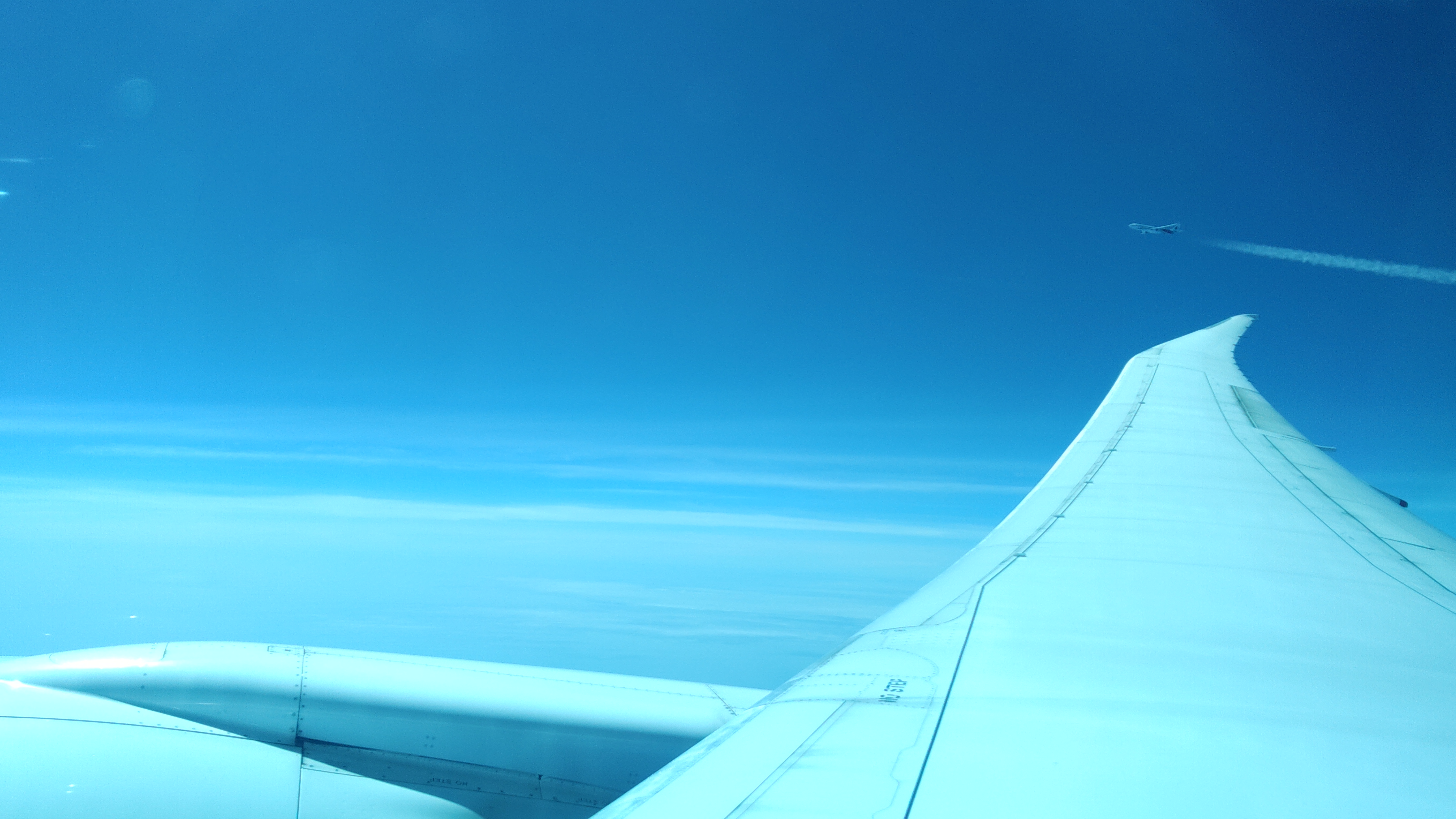 外を見ていたら,並走する別の旅客機が.こちらの方が微妙に速く,次第に追いつき追い越していく. |