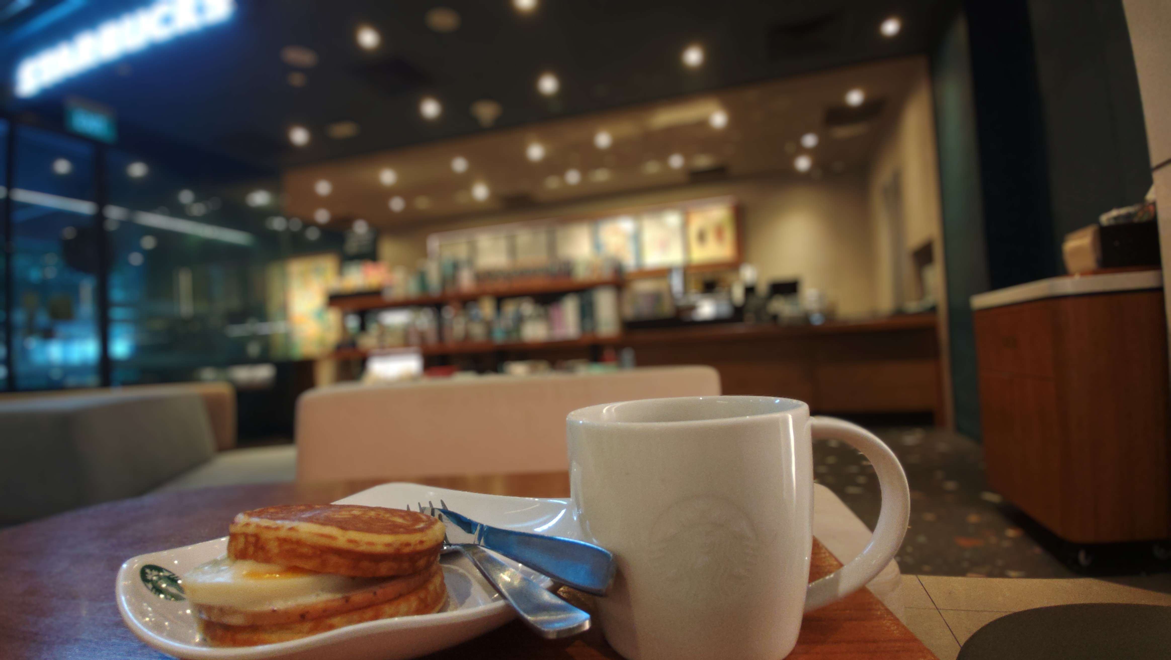 明くる朝は散歩を兼ねて宿から10分くらい歩いたスタバで朝食.バンズが甘いパンケーキで,目玉焼きとはちょっと合わなかった.8 SGDだったからちょうど1000日本円くらい. |