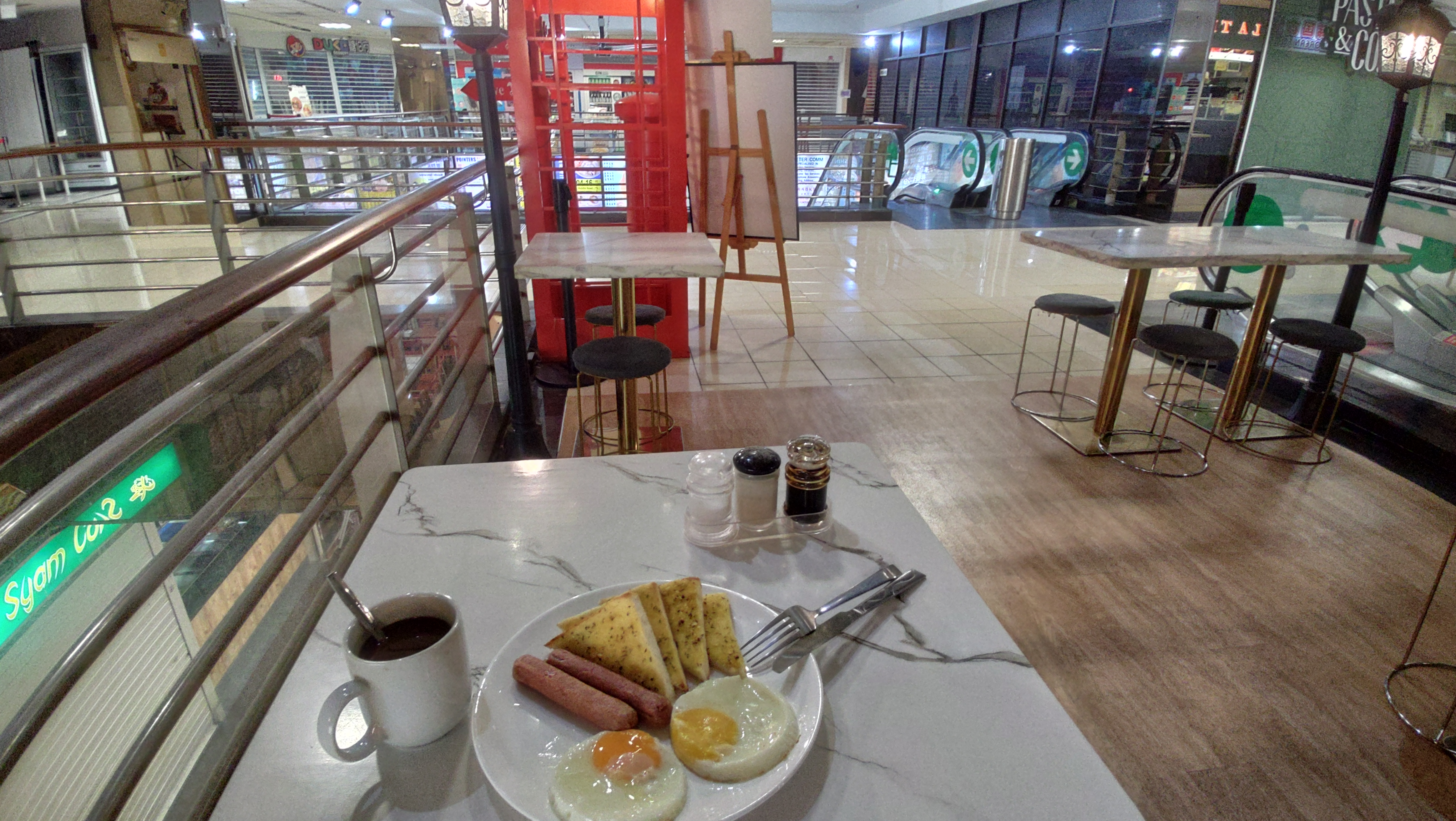 またある日の朝は,Fortune Centreの2階で見つけた La Teh Cafe でモーニング.コーヒーのように見えるのは,Gula Melaka Kopiというマレーシアなどで愛飲されるヤシ糖で甘みを付けたコーヒー.味わいや舌触りはココアっぽい.ガーリックトーストにはちょっとアンマッチ. |