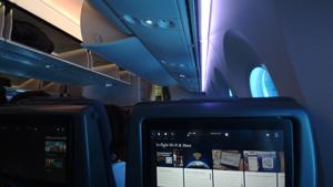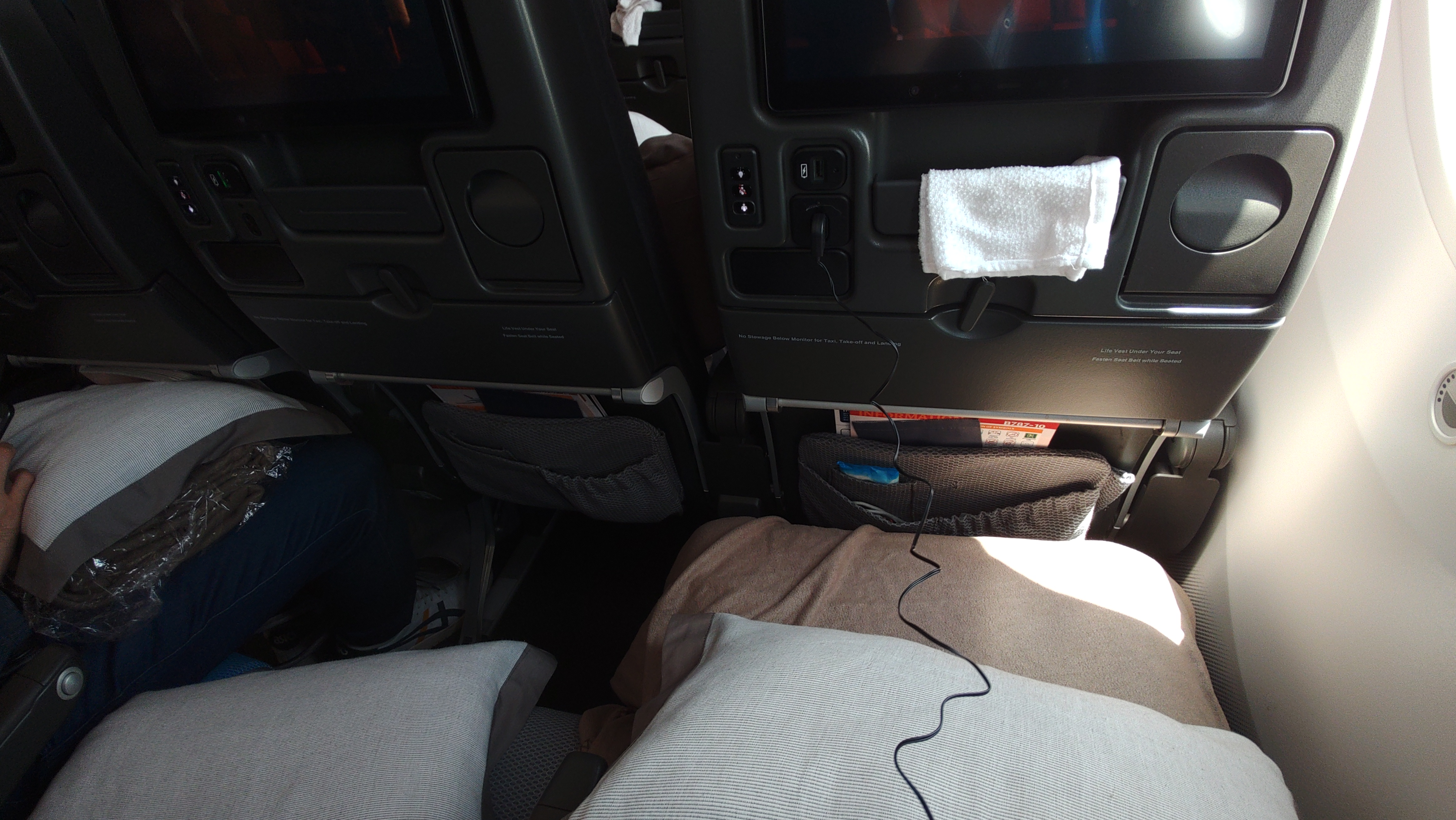 搭乗.6時間飛行の昼便なのでエコノミー窓側で十分.導入直後機のようでとても綺麗. |