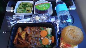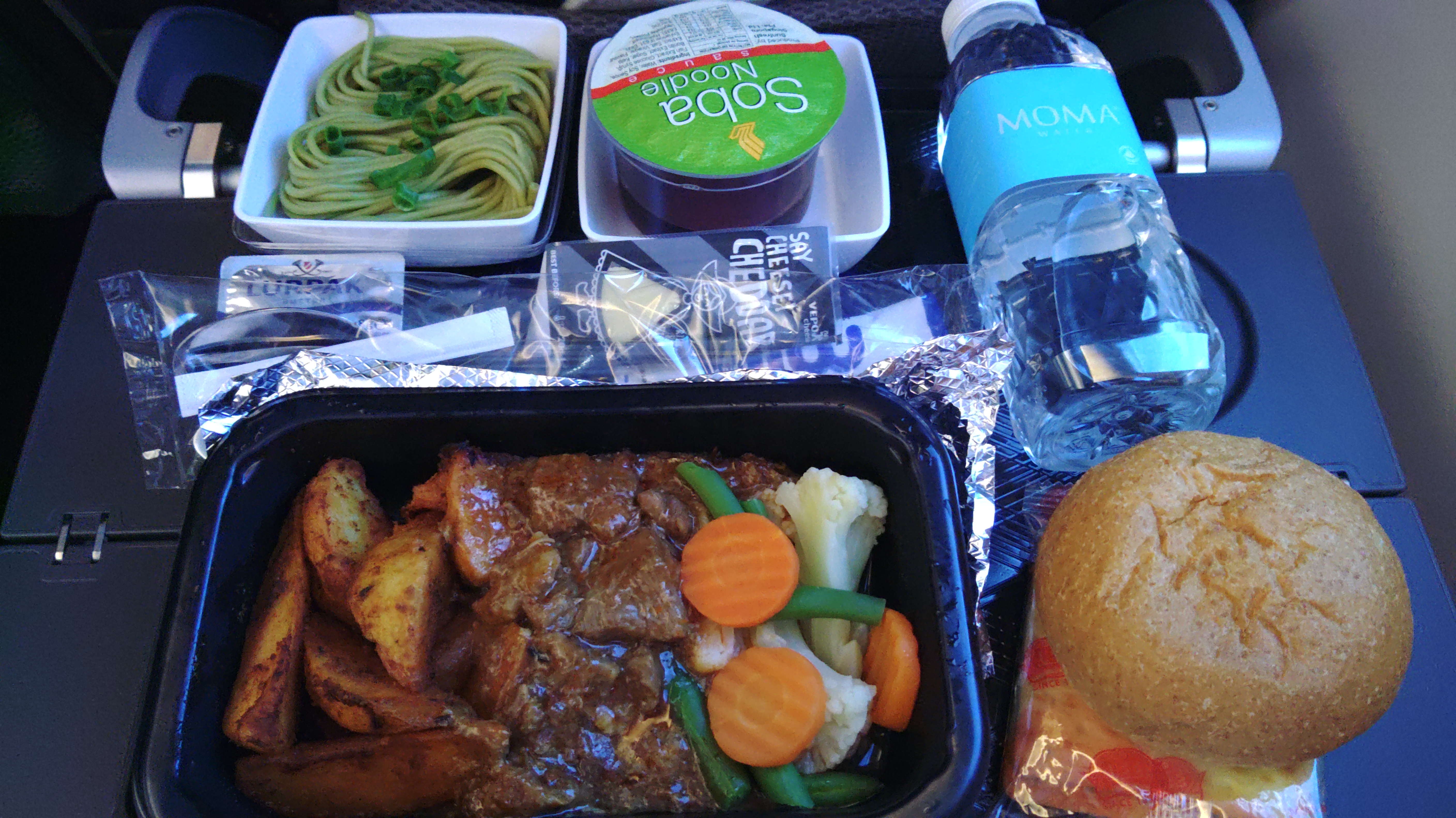 機内食はビーフシチュー的なのをセレクト.機内食で良く出るこの蕎麦も結構好き. |