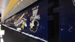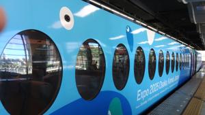 520円課金して,空港特急ラピートで.ちなみにラピートには関空まで4駅停車のαと6駅停車のβがあり,今回はαで関空まで37分(βも大して変わらない).やはりこの時期ならではの万博ラッピングでした. |