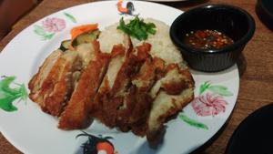参加受付を無事に済ませて名札を受け取り,ホテルへもチェックインできたので,ショッピングモールBugis+で初日の夕食.シンガ風に言えば揚げチキンライス,タイ風に言えばカオマンガイトート. |