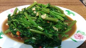 こういうジャンルの食事に欠かせないサイドディッシュである,空心菜の炒め.強めに効いたニンニクが,長旅の疲れを癒し明日への活力をくれます. |
