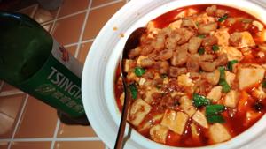 この麻婆豆腐もしっかり辛いんだけど,Dry Hot Potの辛さがすごいのでこっちはだいぶマイルドに感じる美味しさ.中華料理屋なので,ビールはもちろん青島です. |